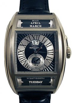 The Chapter II is a collaboration between notable watchmakers Peter Speake-Marin and Daniel Roth. The rollers at the top and bottom of the watch's face serve as a unique way to display the day and month, while the watch's six separate anti-reflective sapphire crystals on the front and back create a striking impression.