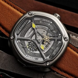 While it is a mechanical watch featuring an automatic movement, it is essentially a Japanese designed Miyota reworked into an unusual dial and watch case. The design for the watch is the brainchild of Emmanuel Dietrich. A cleverly designed case featuring lugs that allows for very easy change of straps. The curved six sided case shape resembles nothing else in the market. The dial is psuedo skeleton with two toned metals in an arrangement that shows off three stepped levels. The overall quality of finish and assembly belies the list price of the watch.