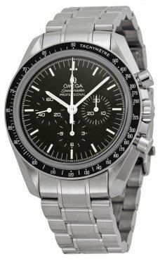 An iconic wristwatch, the Omega Speedmaster Professional Moonwatch features manual winding chronograph movement, approved by NASA for space travel. Modern and compact, this wristwatch includes a hesalite crystal face, tachymeter scale around the bezel, and a steel bracelet.